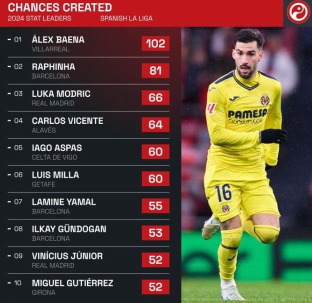 12月28日报道 年终岁末,《Squawka》盘点了西甲本年度创造机会top10,比利亚雷亚尔的巴埃纳以102次居首,拉菲尼亚和莫德里奇位居二三位。