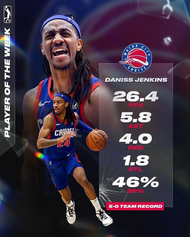 落选后,詹金斯与活塞签下一份双向合同,新秀赛季往返于NBA与G联赛,尽管在NBA的表现不够如意,但是上赛季在G联赛,他场均可以得到12.9分3.3篮板4.9助攻,并且有过单周场均26.4分5.8助攻1.8抢断三分命中率46%、单场41分这样的高光。