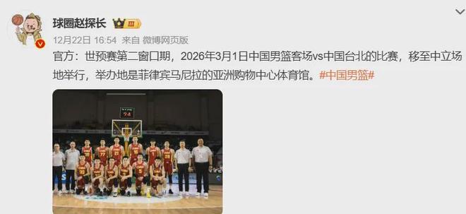 值得一提的是,明年3月1日中国男篮VS中国台北队的比赛,将移至中立场地举办,地点位于菲律宾马尼拉的亚洲购物中心体育馆。