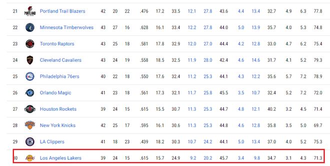 但是,本赛季湖人的防守成为了大漏洞。湖人防守糟糕的问题已经存在不止一个赛季了,球队不仅没有引进足够好的防守悍将,反而导致球队的防守越来越差。湖人本赛季限制对手投篮命中率48.9%,排名联盟倒数第三差,同时是湖人队史近40年最差的表现。