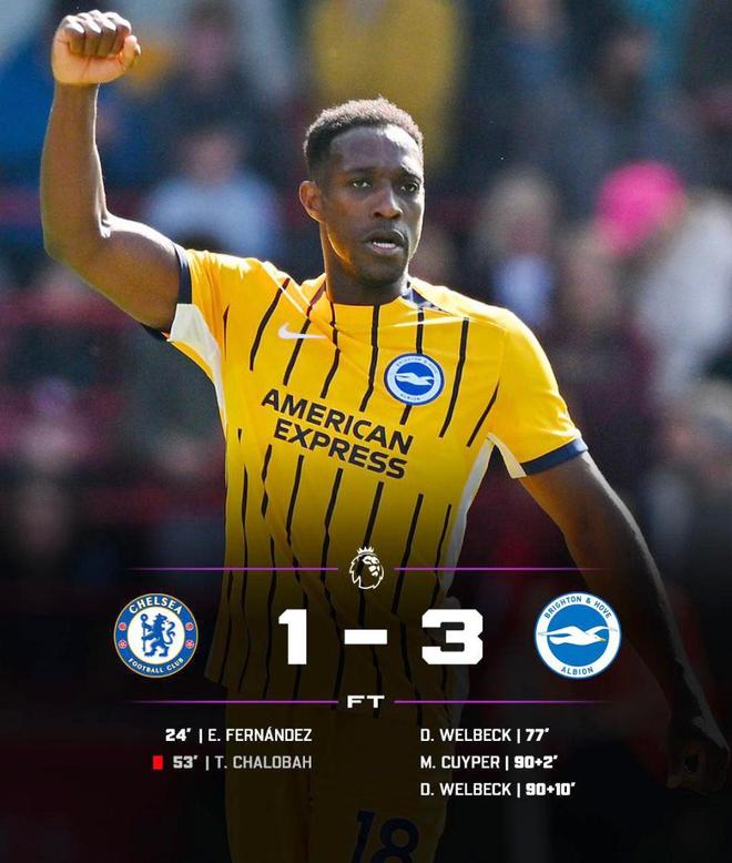 易边再战,第50分钟,场上风云突变,查洛巴因犯规被红牌罚下,切尔西少打一人。人数劣势让局势急转直下,第77分钟,明特助攻曼联旧将维尔贝克冲顶头球破门将比分扳成1-1平手;补时第92钟,阿亚里将皮球传入禁区,魏费尔头球摆渡接力,德克伊珀头球破门,布莱顿2-1反超切尔丁,这还不算完,第99分钟,维尔贝克再下一城,上演梅开二度好戏,彻底杀死比赛;最终切尔西主场1-3惨遭逆转,更是遭到布莱顿的3连杀。