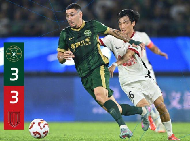 下半场,蓉城主帅徐正源让球队回防,而浙江队则豁出去疯狂进攻。第90+10分钟,浙江队在左侧推进,米特里策直塞,卡列洛在禁区里抽射近角,门将无能为力。蓉城队遭遇了读秒绝平,到手的3分变成了1分。徐正源为自己的保守付出了代价。